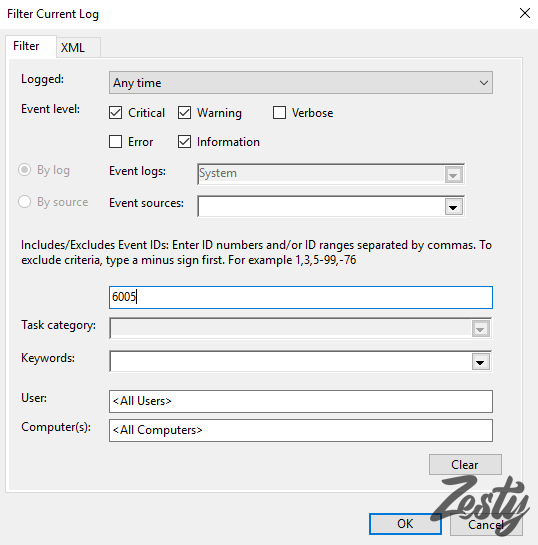 On the **Filter Current Log** window, check the boxes for **Critical**, **Warning**, and **Information**. For the event ID, enter **6005** and click **OK**.